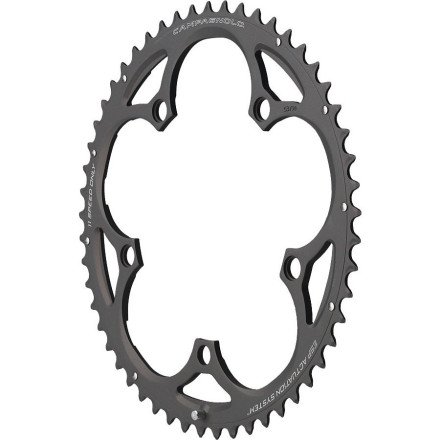 In order to do a proper upgrade to 11, you need not only new Campagnolo Ergopower levers; you need an 11-speed cassette, 11-speed rear derailleur, an 11-speed chain, and 11-speed chainrings. Campagnolo makes 11-speed outer rings for those who want to upgrade their 10-speed cranks, or who need to replace a worn-out ring on their 11-speed cranks.It is not a 10-speed ring re-labeled; 11-speed is it's own thing. For one, the teeth are 0.4mm narrower. There are also four separate ramp systems built into the ring, rather than the two upshift and two downshift zones apiece on their 10 rings. The beautiful finish is the result of a new anodization process that is much stronger and lasts four-times longer than the old finish.These 11-speed rings will work with most current 10-speed Campagnolo cranks. The two exceptions are Centaur and Veloce cranks, where the spacing is different due to the fact that both cranks utilize narrower stamped chainrings. 11-speed rings are machined. You might be tempted to stick with your current 10-speed rings to save a little cheddar. Campy can't guarantee that your shifting will work with the older 10-speed rings. The slight difference in the width of teeth could result in chain suck. And the law of chain suck is it happens when you need it least.The Campagnolo 11-speed outer chainring is available in three sizes: 53 and 52 teeth in 135mm bolt circle diameter (standard) and 50 teeth in 110bcd (compact).The actual weight of the 50 tooth chainring is 101g, the 52 tooth is 87g and the 53 tooth is 96g.Product Features