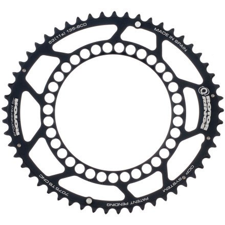 The engineers at Rotor Bike Components developed their original Rotor Crank to maximize the efficiency of your pedal stroke by prolonging the power zone and minimizing dead spots. With these ovalized Road Outer Q-Rings, you can have the majority of the benefit of the Rotor crankset, but you can use the crank of your choice (Shimano, Campy, SRAM, et al). And with redesigned shift pins and ramping, Q-Rings shift without hesitation. Any assumptions that this is rehashed Biopace are wrong. To the contrary, Rotor Road Outer Q-Rings will help you produce more power and reduce fatigue. They capitalize on the strongest part of your pedal stroke and minimize the negative effects of dead spots. The Q-Rings have a subtle oval shape and, with multiple mounting holes, can be 'clocked' to maximize the effects for your biomechanics, pedaling style, and bike geometry. The Q-Ring's oval shaping smoothes the pedal stroke through the dead spots and takes advantage of your power potential at the optimum time -- in the power zone. The multiple mounting hole system is called OCP (Optimum Chainring Positioning) and it allows each rider to maximize the benefit of the Q-Rings. The long axis of the oval chainring should be vertically aligned in the power zone when the crankarms are at or just below horizontal. This position gives the rider maximum leverage, and therefore maximum torque transmission to the rear wheel. Inversely, the short axis of the chainring is aligned so that it nears the vertical when the crankarms are also close to vertical. "...you'll put more power to the ground while taxing your muscles less..." The short axis of the oval creates a shorter lever when you make less power. The effect is a subtle acceleration of the legs through the top and bottom of the stroke and less muscle strain at these traditionally weak points in the cycle. With Q-Rings, you'll put more power to the ground while taxing your muscles less.